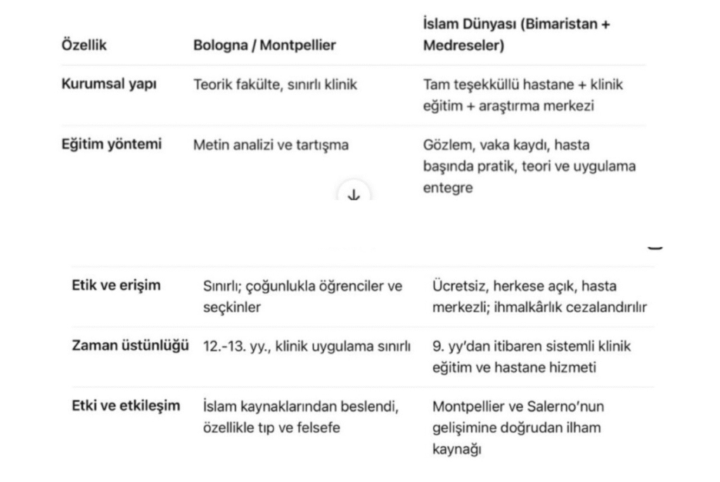 • Bologna ve Montpellier’in tıp ve hukuk alanındaki yüksek öğrenim misyonu, İslam dünyasında bimaristanlar ve entelektüel medreseler tarafından daha erken ve daha kapsamlı şekilde yerine getirilmekteydi.
