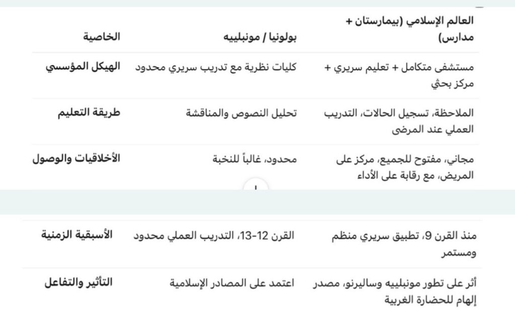 • رسالة التعليم العالي في الطب والقانون في بولونيا ومونبلييه كانت تُؤدى في العالم الإسلامي بشكل أسبق وأشمل من خلال البيمارستانات والمدارس الفكرية.